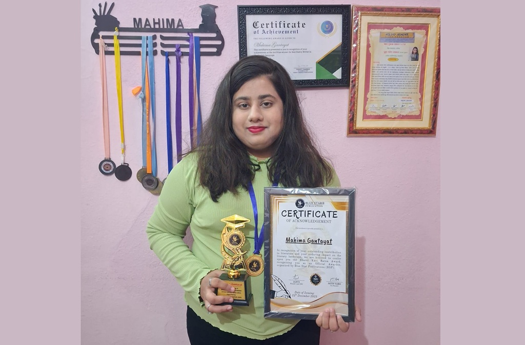 ଭୁବନେଶ୍ଵର : ଯୁବ ଲେଖିକା ଭାବେ ନିଜ ସୃଜନଶୀଳ ଉତ୍କର୍ଷ ପାଇଁ ଜଣାଶୁଣା ରାୟଗଡ଼ା ମହିଳା ମହାବିଦ୍ୟାଳୟର ଛାତ୍ରୀ ମହିମା ଗନ୍ତାୟତଙ୍କୁ ଦିଲ୍ଲୀ ସ୍ଥିତ “ଦି ବ୍ଲୁ ଷ୍ଟାର ପ୍ରକାଶନ”ର ପ୍ରତିଷ୍ଠିତ “ଭାରତ କବି